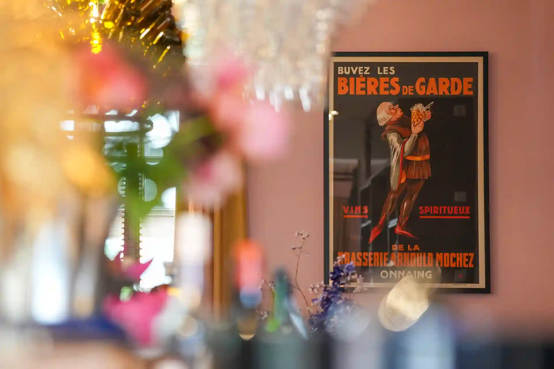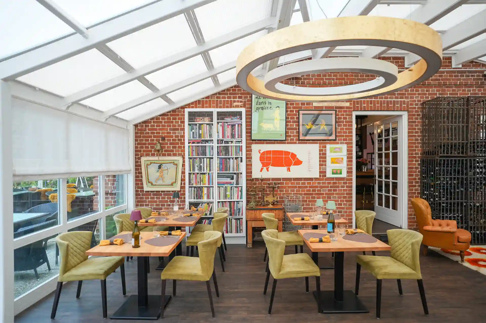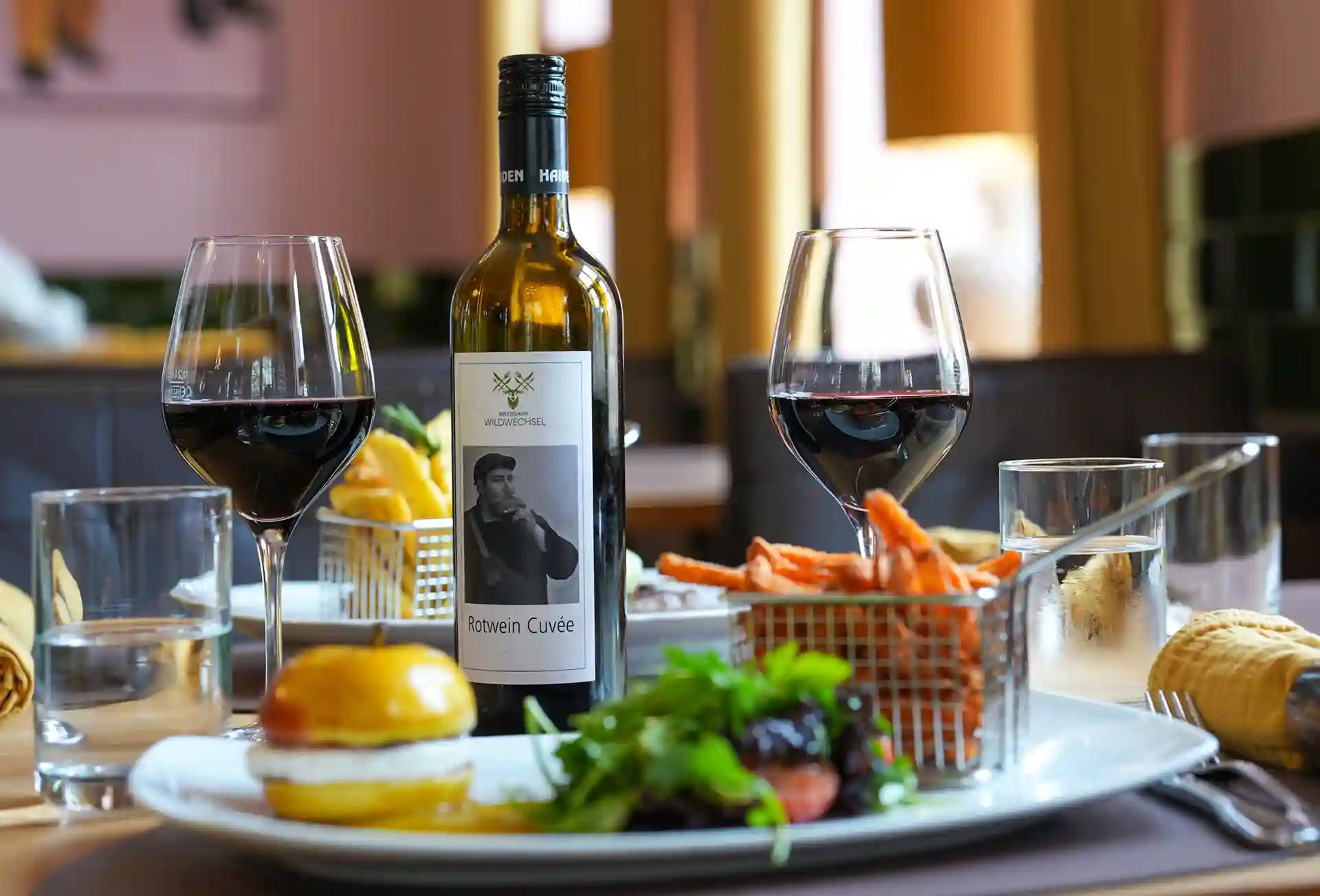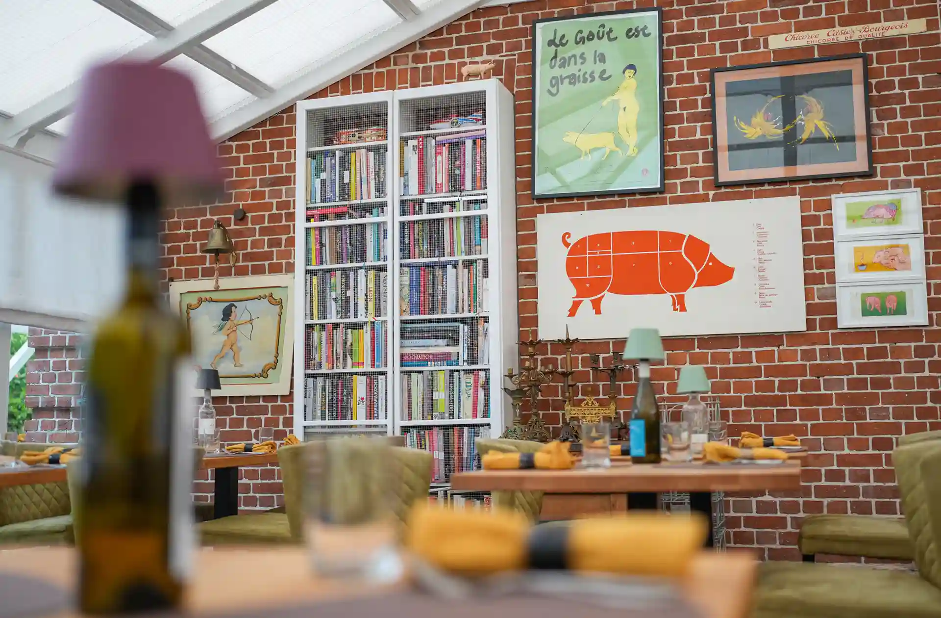 Auch die Einrichtung sorgt für eine einmalige gemütliche und stimmungsvolle Atmosphäre. Zwei Lounges, eine mit einer Lampe aus einem alten französischen Flaschentrockner, Weinkäfige, Teppiche aus den 70ern, Möbeln aus allen Epochen, ein Michelin Männchen oder Teller von Limoges – wie im Wildwechsel – es gibt viel zu entdecken.