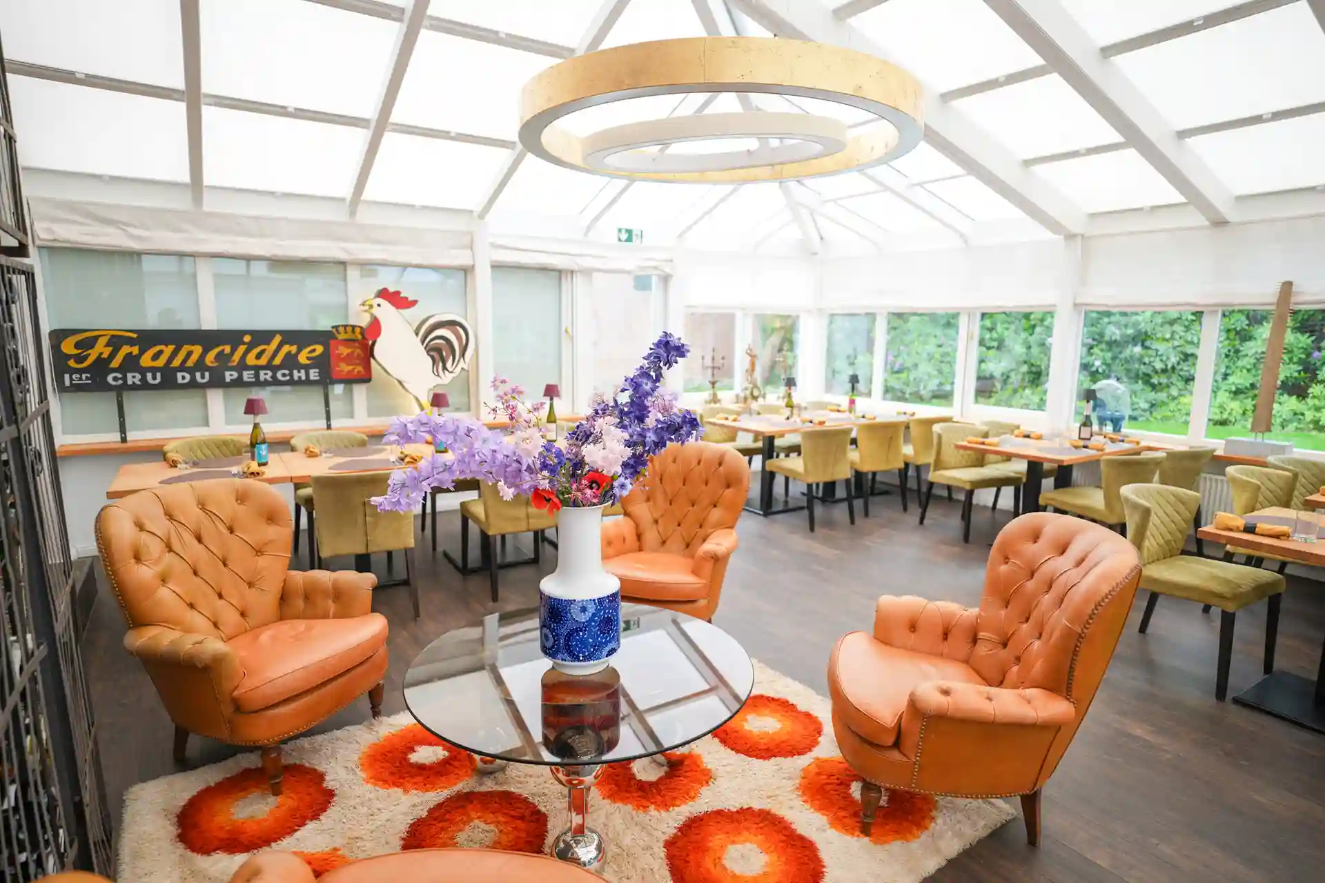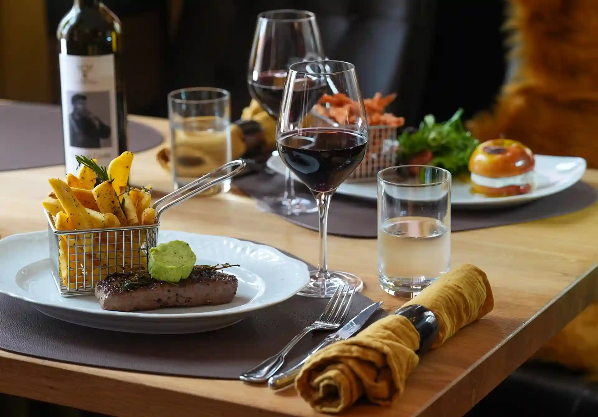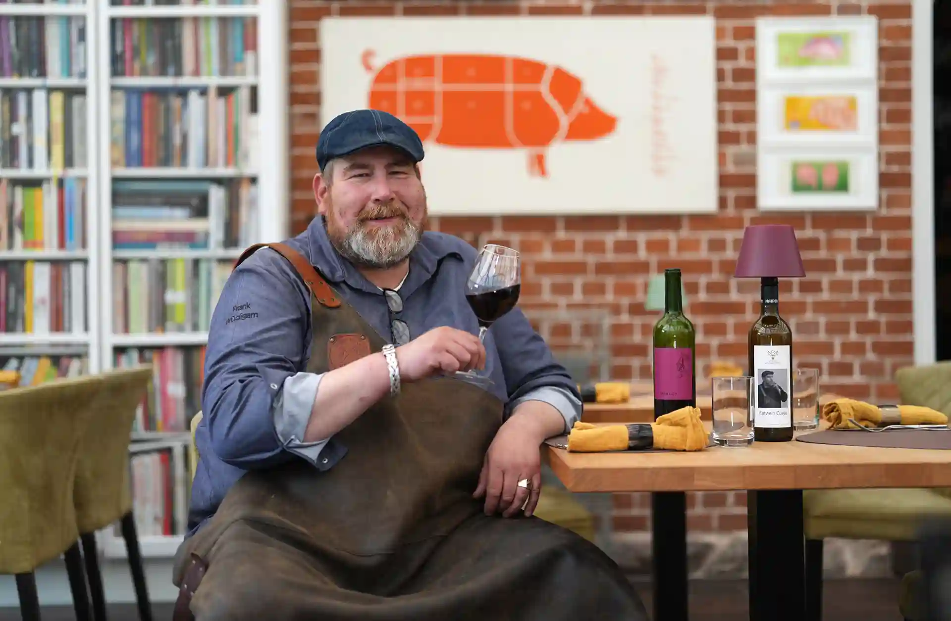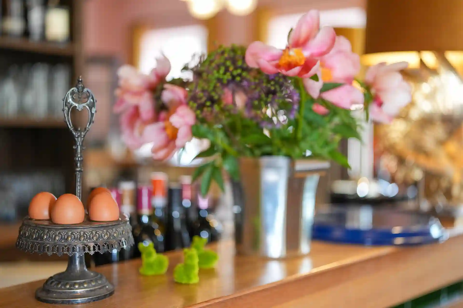 Auch die Einrichtung sorgt für eine einmalige gemütliche und stimmungsvolle Atmosphäre. Zwei Lounges, eine mit einer Lampe aus einem alten französischen Flaschentrockner, Weinkäfige, Teppiche aus den 70ern, Möbeln aus allen Epochen, ein Michelin Männchen oder Teller von Limoges – wie im Wildwechsel – es gibt viel zu entdecken.