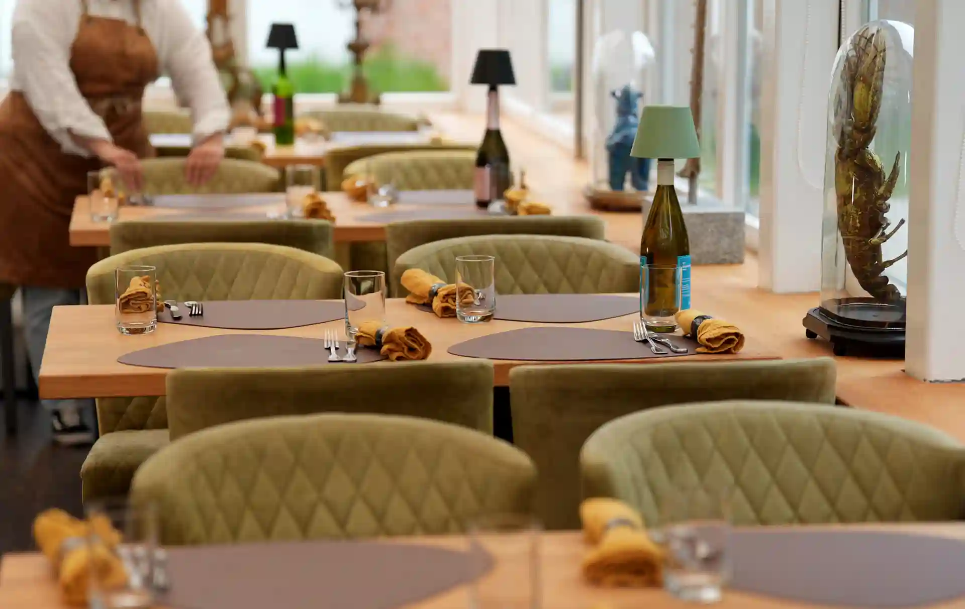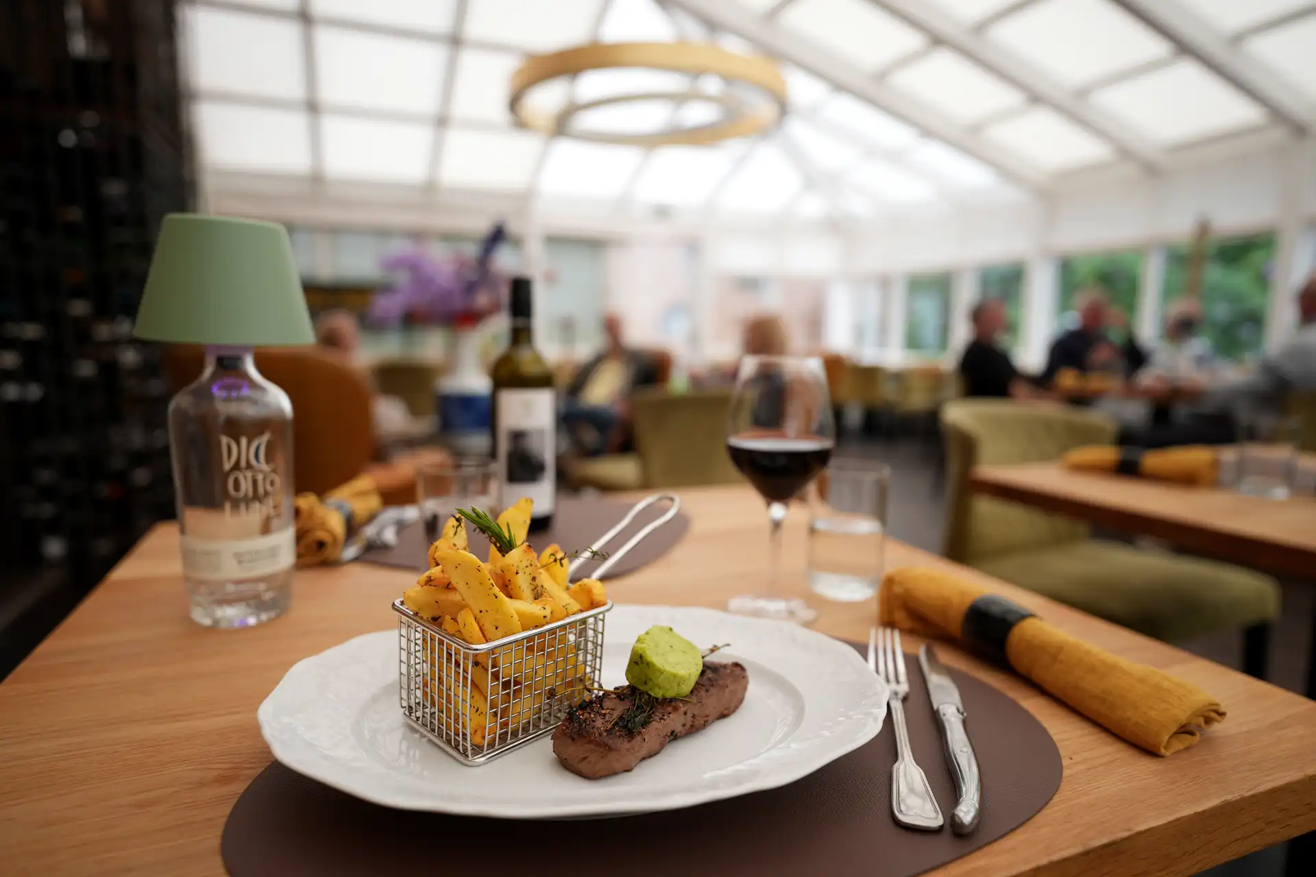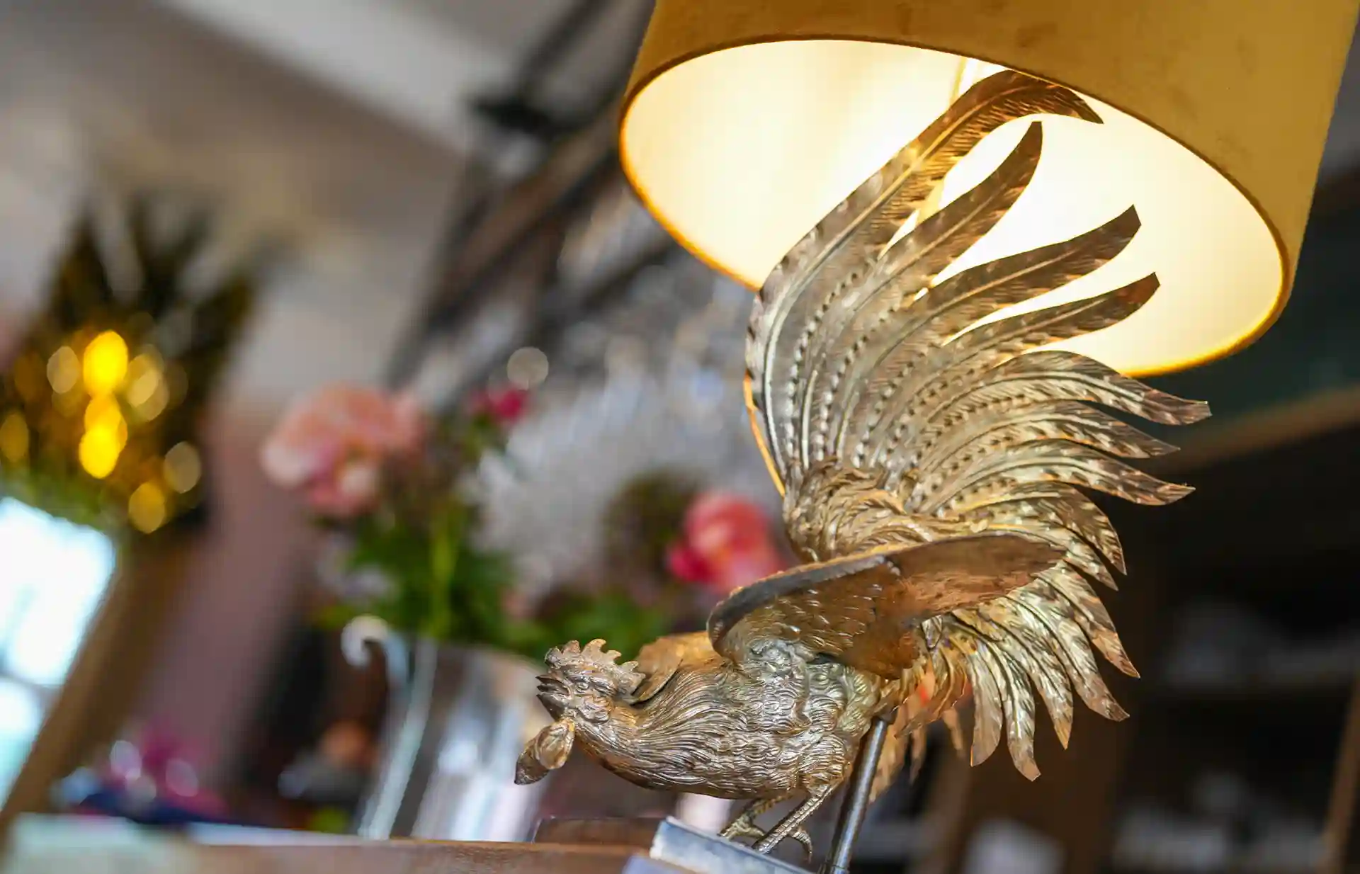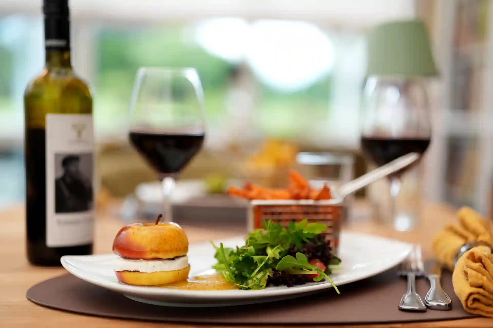 Auch die Einrichtung sorgt für eine einmalige gemütliche und stimmungsvolle Atmosphäre. Zwei Lounges, eine mit einer Lampe aus einem alten französischen Flaschentrockner, Weinkäfige, Teppiche aus den 70ern, Möbeln aus allen Epochen, ein Michelin Männchen oder Teller von Limoges – wie im Wildwechsel – es gibt viel zu entdecken.