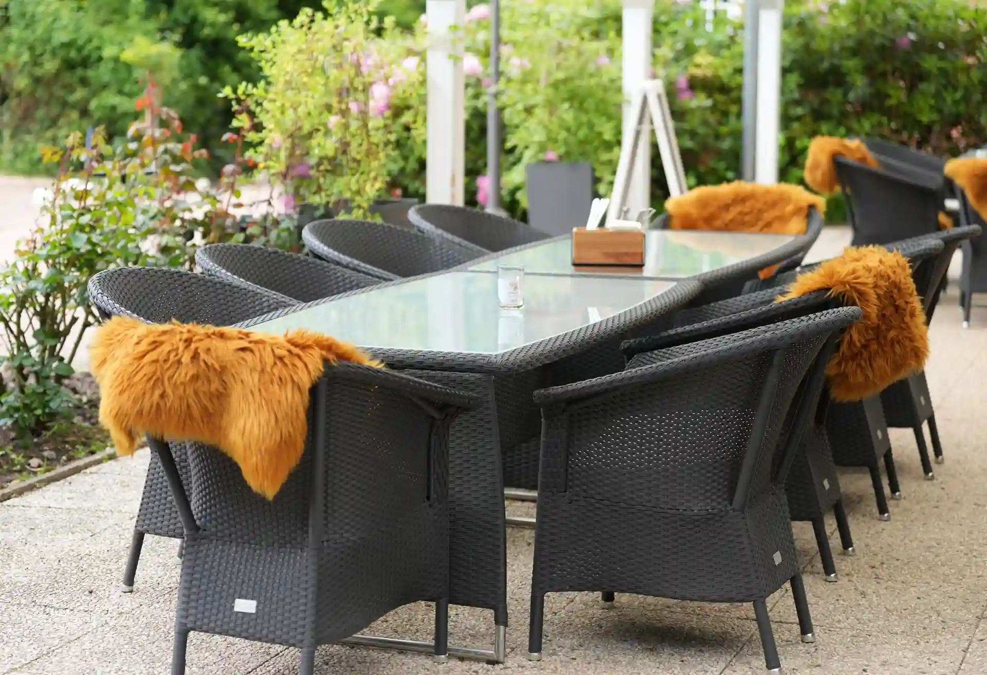 Die wunderschöne Terrasse mit Blick auf das satte Grün des Golfclubs ist der ideale Ort, um bei einem Glas Wein oder einem Café au Lait zu entspannen.