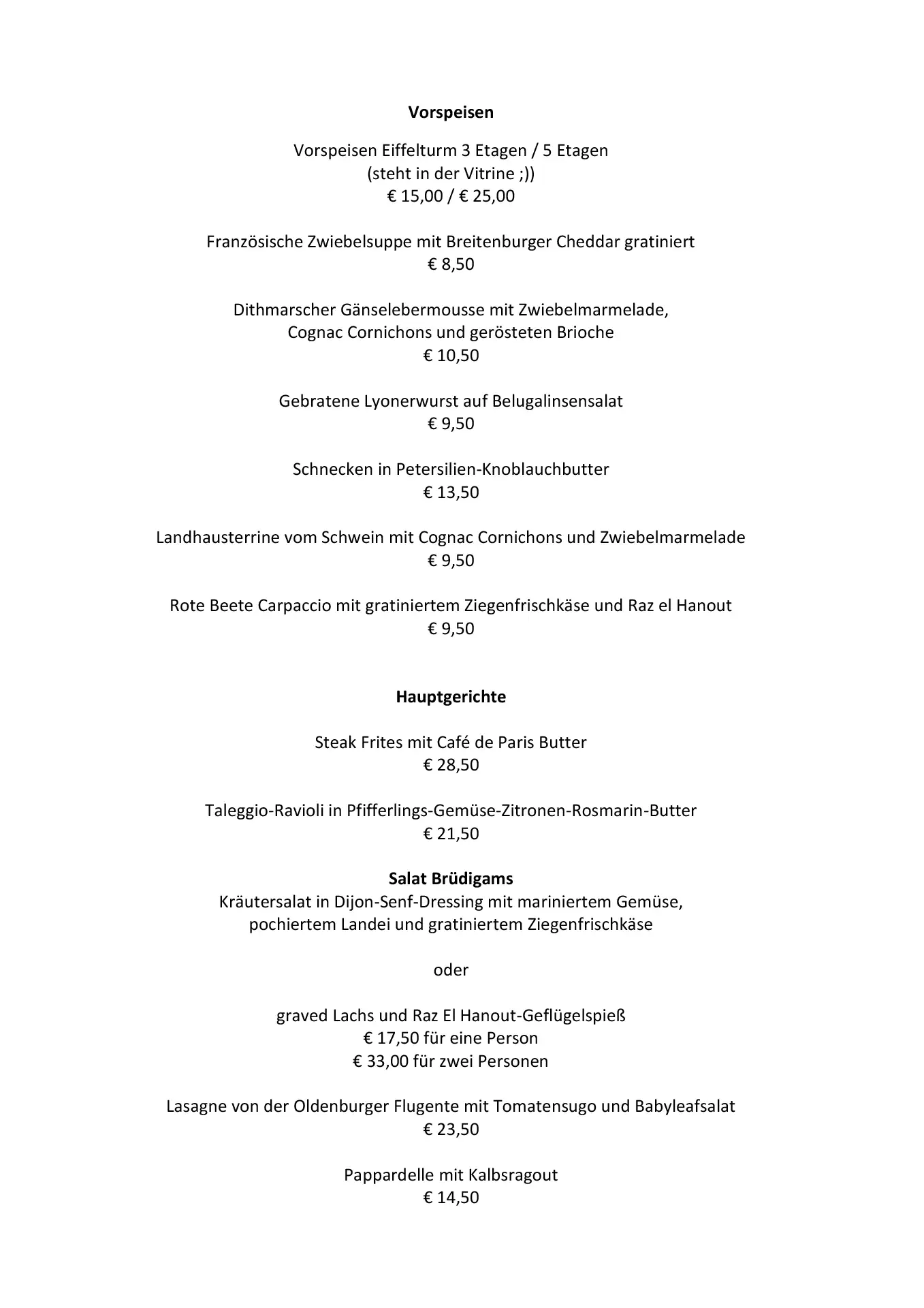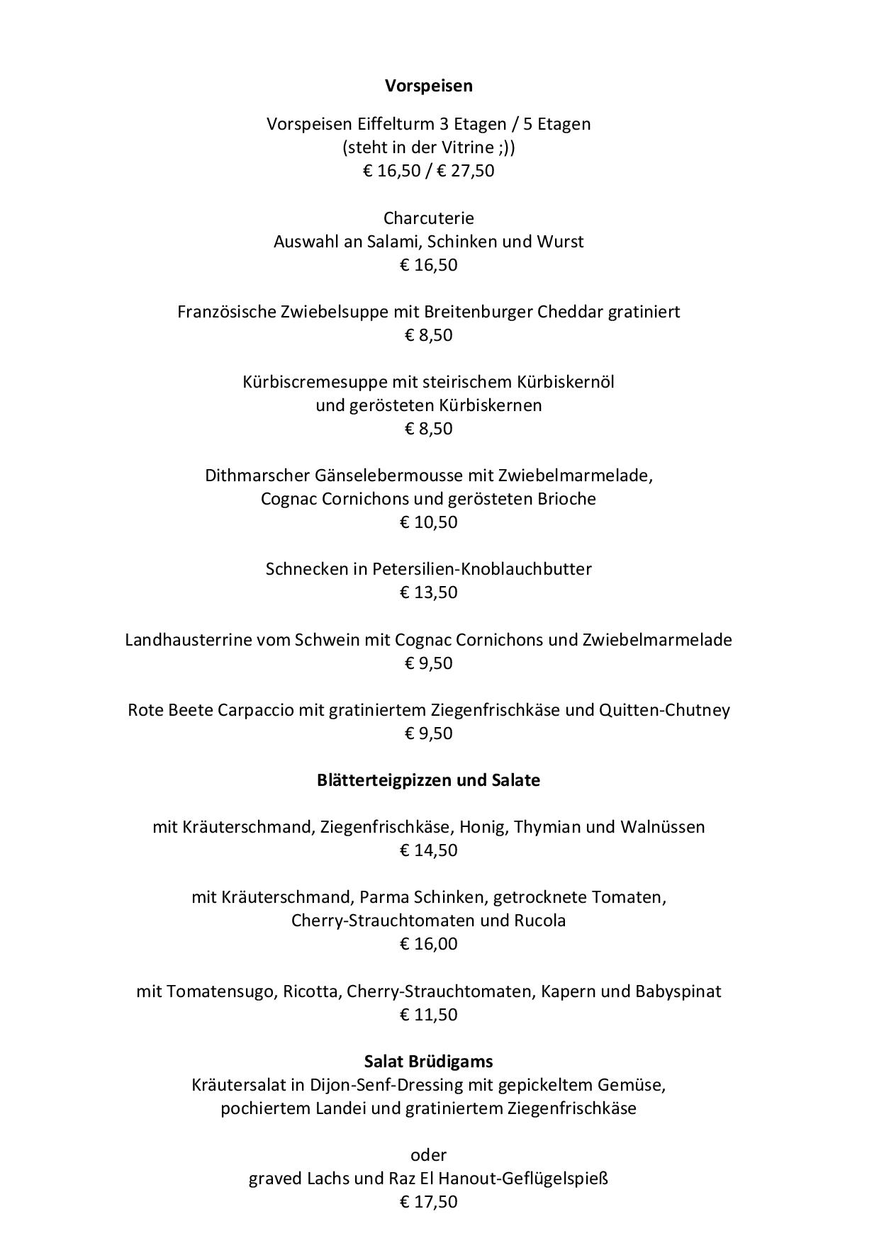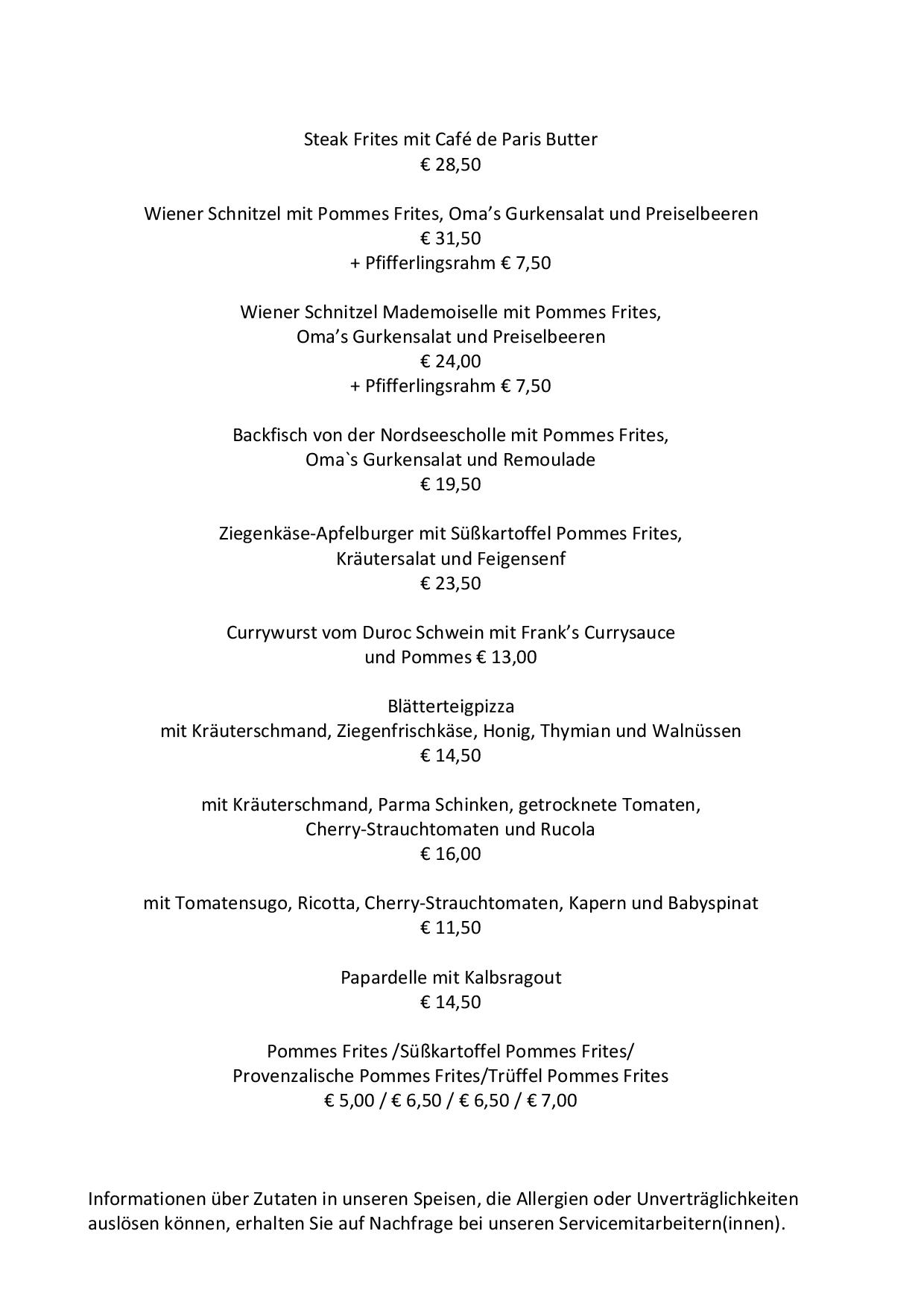 Die Küche ist ein Mix aus Frankreich und Norddeutschland. Steak Frites, Schnecken, Frikadelle mit Kartoffelsalat, Blätterteigpizza, um nur einiges zu nennen. Französisch inspirierte Desserts und selbst gebackener Kuchen findet ihr auch bei uns. Natürlich haben wir auch an Vegetarier gedacht.